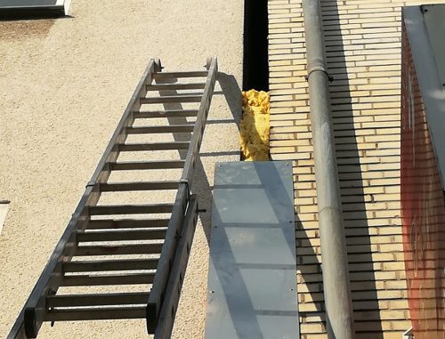 Wie zuvor schon beschrieben gibt es öfters auch Gebäudetrennfugen, die seitlich offen sind. Bevor eine Einblasdämmung durchgeführt werden kann, müssen die Seitenbereiche verschlossen werden. Wir verschließen diese Bereiche stabil und verkleiden die Trennfuge mit Zinkblechen. Optisch gewinnt das Gebäude und es ist eine saubere Lösung. Die Gebäudetrennfuge und die Einblasdämmung sind zusätzlich gegen Witterungseinflüsse und Schlagregen geschützt.