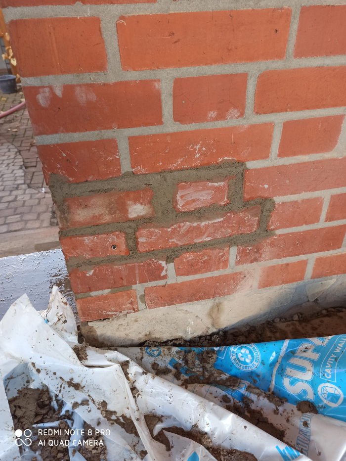 Auf den Fotos unten sehen Sie, wie von uns ein Hohlmauerwerk geöffnet, gereinigt und im Anschluß wieder verschlossen wurde. Es handelte es sich hier um eine Klinkerfassade. Durch das Entfernen des Bauschutts wurden „Schwachstellen in der Dämmschicht“ vermieden, so dass die Wände sauber verfüllt werden konnten. Bei diesem Wohnhaus wurde des Mauerwerk mit loser Mineralwolle WLG 035 ausgeflockt.